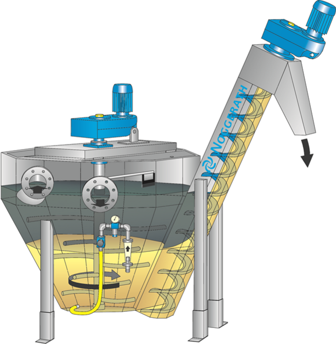 安装在清洗池中的搅拌器的循环运动导致砂粒分离成轻质和重质成分。安装在清洗池下部区域的搅拌指使砂粒颗粒相互摩擦并通过磨蚀除去粘性有机残留物。有机残留物在上升流动过程中被洗掉。